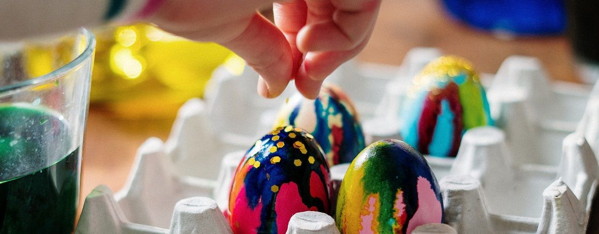 Give them an apron (check out our tip here on how to make your own), throw some paper or an old cloth on the table, and give them different materials for decorating their eggs: