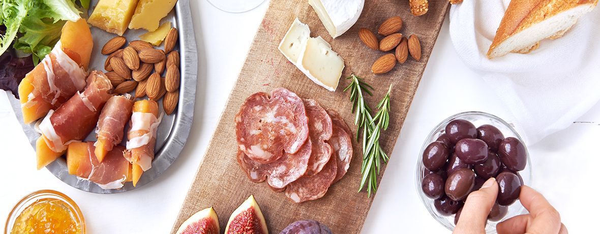 Grands classiques des 5@7, ces plateaux bien garnis peuvent faire office de bouchées apéro à eux seuls, lorsqu’ils sont bien préparés : Fromages : Variez les types de pâtes (molle, ferme, semi-ferme, persillée, fraîche) et de lait (vache, chèvre, brebis), et osez offrir des fromages véganes pour une touche d’originalité. Prévoyez 75 g de fromage par personne pour une entrée. Charcuteries : Misez également sur la variété (jambons, pâtés, terrines, saucissons, etc.) et prévoyez environ 80 à 100 g de charcuteries par personne. À voir à la baisse si votre plateau contient aussi une sélection de fromages. Compléments : Des croûtons, du pain frais, des fruits frais ou séchés, quelques condiments marinés, des moutardes et des gelées compléteront vos plateaux à merveille.La touche locale